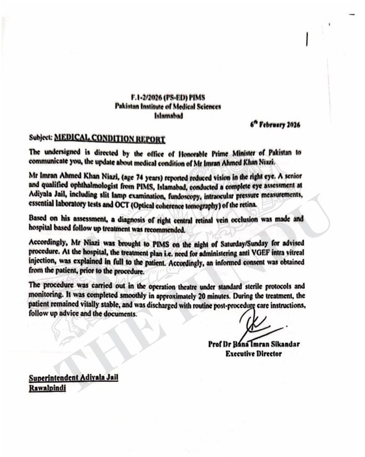 स्थानीय मीडिया ने बताया कि श्री सफदर की रिपोर्ट के बाद, सुप्रीम कोर्ट ने गुरुवार (12 फरवरी, 2026) को पाकिस्तानी अधिकारियों को श्री खान की आंख की जांच करने के लिए एक मेडिकल बोर्ड गठित करने और उन्हें अपने बच्चों से बात करने की अनुमति देने का आदेश दिया।